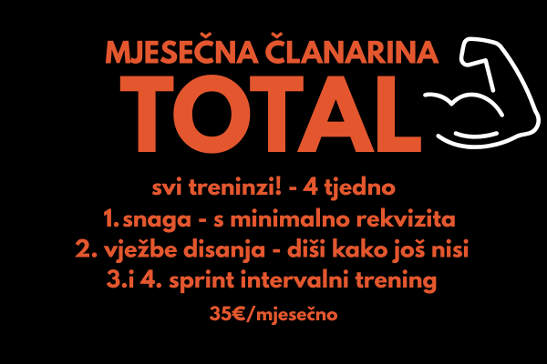 Pristup svim treninzima za 35€ mjesečno (moguće uzeti i samo trening disanja, samo sprint treninge ili samo trup-ruke-noge)